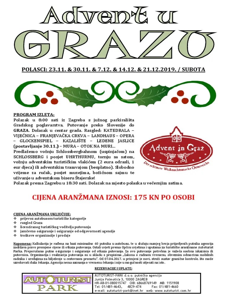 +385 1 4008 180 info@ideaputovanja.hr. Polazak moguć sa stajališta ljubeščica na auto cesti za putnike s područja varaždina uz obaveznu najavu kod rezervacije putovanja. Iskoristite first minute i last minute akcije! +385 1 481 13 89.